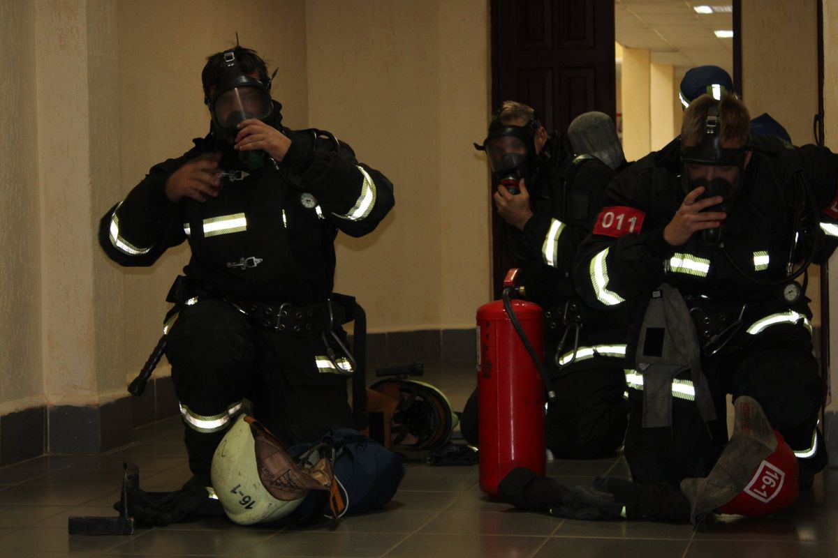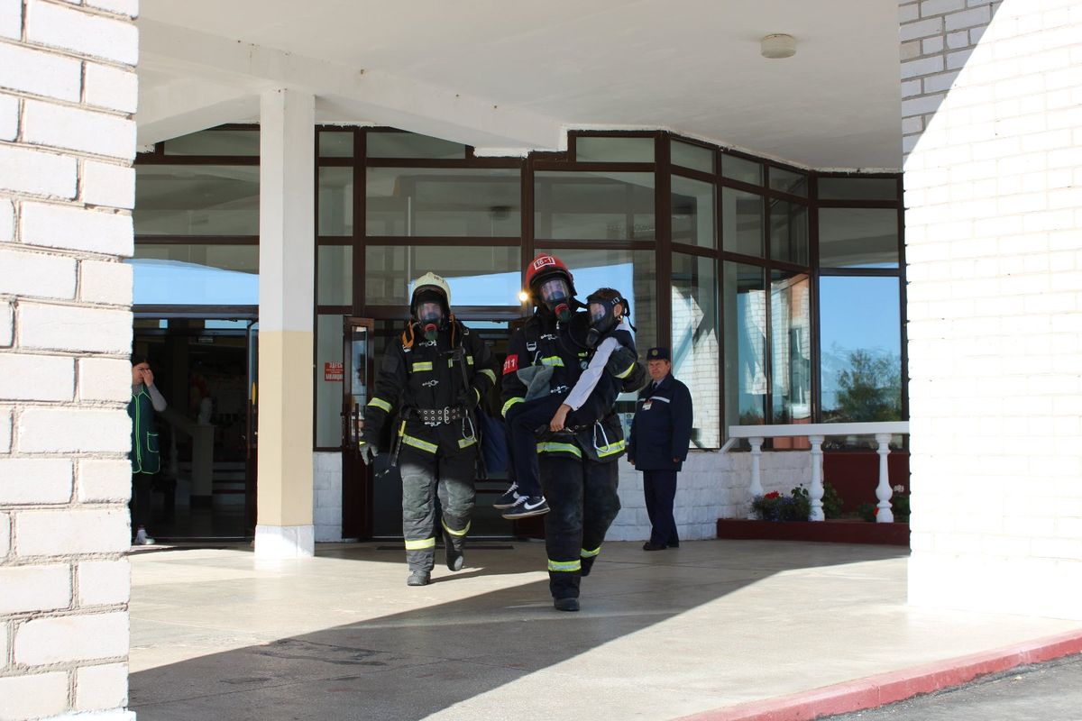 По тактическому замыслу в здании школы произошло возгорание. На первом этаже учреждения остался один ученик, наблюдалось плотное задымление. При выбытии работники МЧС обнаружили очаг условного пожара, провели разведку во всех помещениях, ученика, который остался в здании, отыскали и вынесли на свежий воздух.