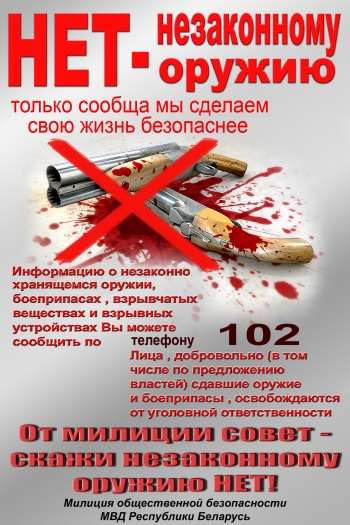 С информацией о незаконно хранящемся оружии, боеприпасах и взрывчатых веществах вы можете обратиться по телефону доверия в ОВД Мстиславском райисполкома: 50–447, м.т.:80333820308. Либо по телефону 102 (круглосуточно). Анонимность гарантируется.