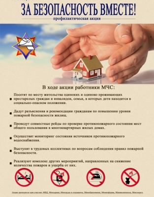 С целью повышения уровня безопасности населения, активизации пожарно-профилактической работы, анализа ее эффективности и оценки готовности территорий к весенне-летнему пожароопасному периоду с 11 по 27 апреля в районе пройдет республиканская акция по предупреждению пожаров и гибели людей от них в жилищном фонде «За безопасность вместе».