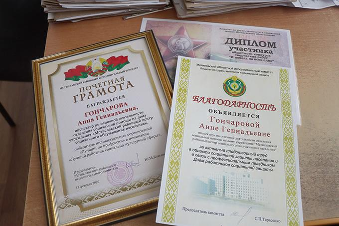 По итогам работы за 2025 год Анна Геннадьевна признана победителем соревнования среди работников ведущих профессий. На районном слёте передовиков она награждена почётной грамотой райисполкома в номинации «социальная работа».